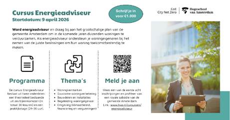 De Hogeschool van Amsterdam start op verzoek van de gemeente een cursus Energieadviseur. De komende jaren moeten meer dan 50.000 woningen met energielabel D,E,F,G geïsoleerd worden. (Zie ook artikel over subsidie hieronder).Met deze korte, praktijkgerichte cursus leer je alles wat je nodig hebt om aan de slag te gaan als specialist in de energietransitie. De cursus start op 9 april 2026 en duurt 3 tot 4 maanden. Op de website van de Hogeschool van Amsterdam lees je meer over deze cursus.